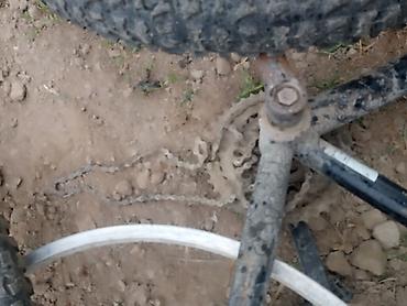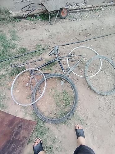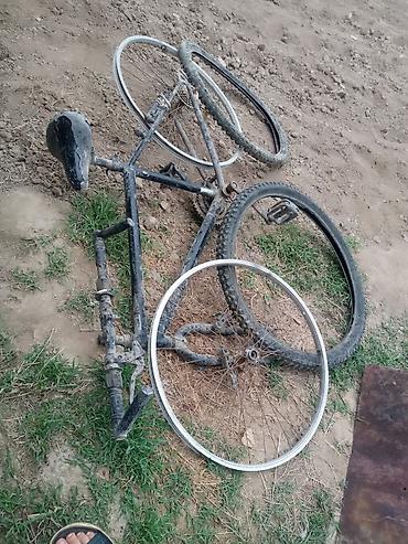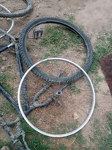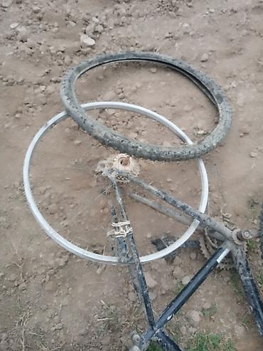 Представлена рама велосипеда черного цвета, частично разобранная, с видимыми признаками использования и загрязнения. В комплекте присутствуют два колеса, одно из которых с шиной с выраженным протектором, а другое — только обод со спицами. Также видны педали, сиденье и цепь. Рама имеет стандартную конструкцию, выполненную из металлического сплава. Детали подходят для ремонта, восстановления или сборки велосипеда.