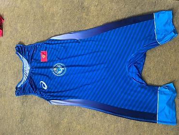 Борцовские трико Asics (2 шт.) -Размер 2XS - Цвета: красное и синее. - Национальная символика Кыргызстана спереди, надпись «KGZ» на спине. - Крой: классический соревновательный с закрытой спиной, д...