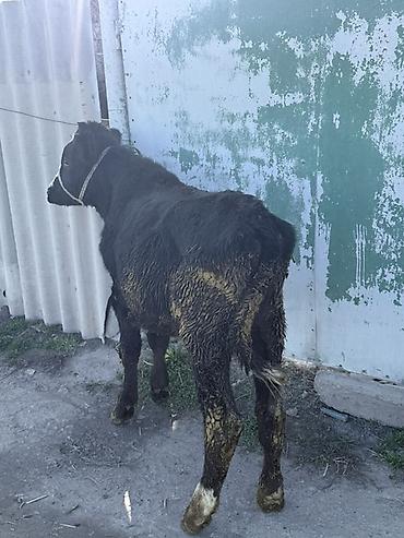 Телёнок (бычок), чёрный окрас с белыми отметинами на копытах и на задней ноге. На фото — фактическое животное.