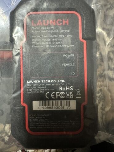 - Диагностический терминал LAUNCH DBScar VII (Bluetooth/OBDII), рабочее напряжение 9–18 В, ток ≤150 мА, диапазон температур −10…+50 °C, габариты 118.3×69.5×32 мм.