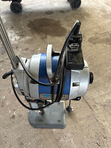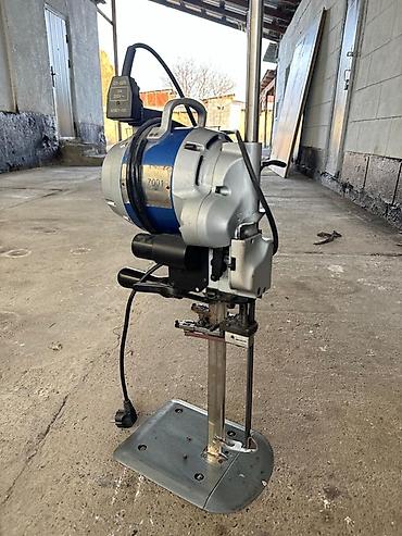 Промышленный раскройный нож для тканей на стационарной платформе.