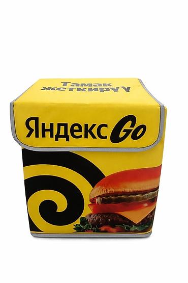 Термо-рюкзак/сумка для доставки еды Яндекс Go. - Формат: короб-рюкзак с жёсткими стенками и клапаном‑крышкой. - Цвет и брендинг: яркий жёлтый с логотипом «Яндекс Go» и надписью «Тамак жеткирүү» (д...