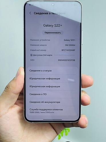 - На фото отображены данные устройства в меню “Сведения о телефоне”: Galaxy S22+, модель SM‑S906N, IMEI виден на экране.