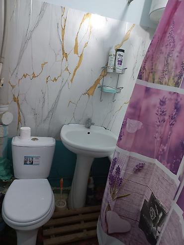 - Отдельный санузел с душем: унитаз, раковина на пьедестале, душевая штора, полочки для принадлежностей.