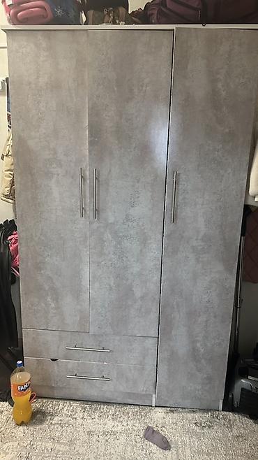 1) Шкаф-купе/распашной, 3‑дверный, с двумя выдвижными ящиками внизу. Цвет — серый бетон. Прямые металлические ручки, цоколь по периметру. Внутри предусмотрены отделения под одежду и полки (видно по габаритам секций).