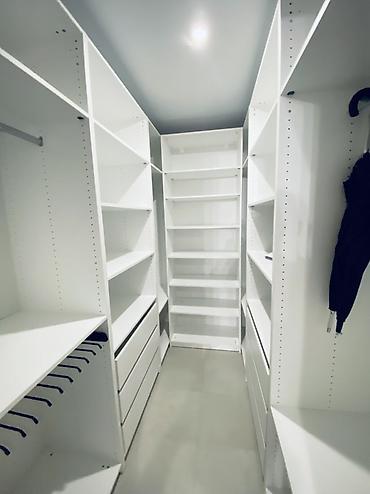 - Встроенная гардеробная в светлом минималистичном стиле: модульные секции из белых ЛДСП с регулировкой по высоте полок.