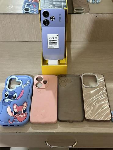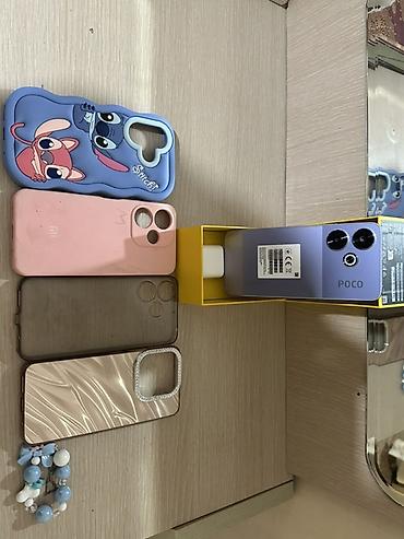 Смартфон POCO (фиолетовый цвет) с комплектом аксессуаров.