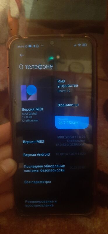 - На экране раздел «О телефоне» подтверждает модель Redmi 9C, версию MIUI и объём хранилища.
