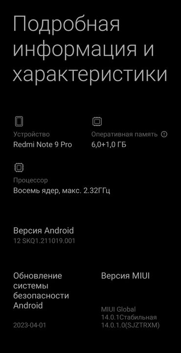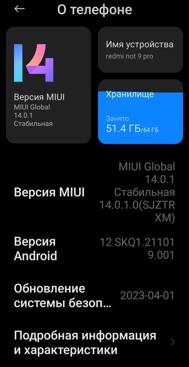 - Экранные снимки раздела «О телефоне» прилагаются: MIUI Global 14.0.1, Android 12, обновление безопасности от 01.04.2023.