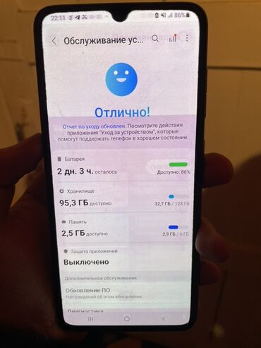 - Аккумулятор: в разделе “Обслуживание устройства” отображается прогноз работы “2 дн. 3 ч.”, уровень заряда на скриншотах 85–86%.