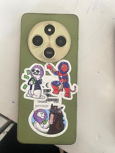 Экран с центральным вырезом под фронтальную камеру. На задней панели — круглый модуль камер с надписью 50MP AI Camera (тройной блок + вспомогательный датчик), корпус зелёного цвета. На крышке наклейки (видно на фото).