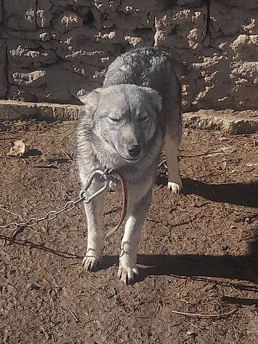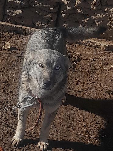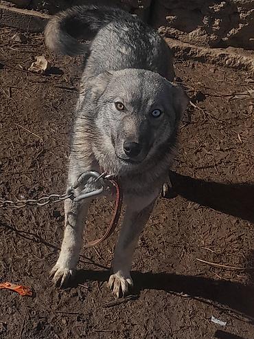 Собака северного типа с гетерохромией (одно карее, другое голубое глаз). Компактного роста, крепкий костяк, густая серо-черная шерсть с серебристым подпалом, пушистый хвост. Пропорциональная морда, стоячие уши. На шее кожаный ошейник, крепкая цепь/карабин.