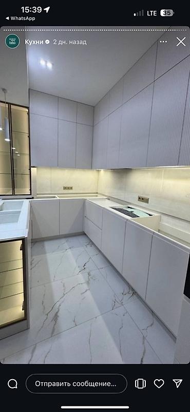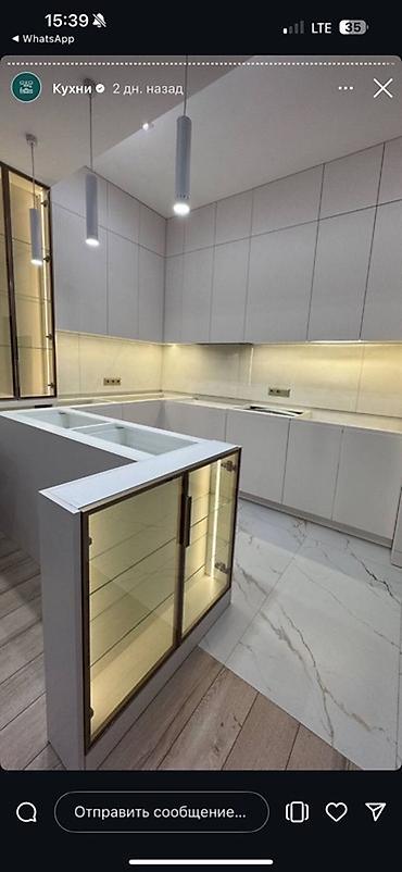 - Компоновка: угловая кухня с прямыми фасадами и интегрированными ручками, дополнительный полуостров/бар с витринным модулем.