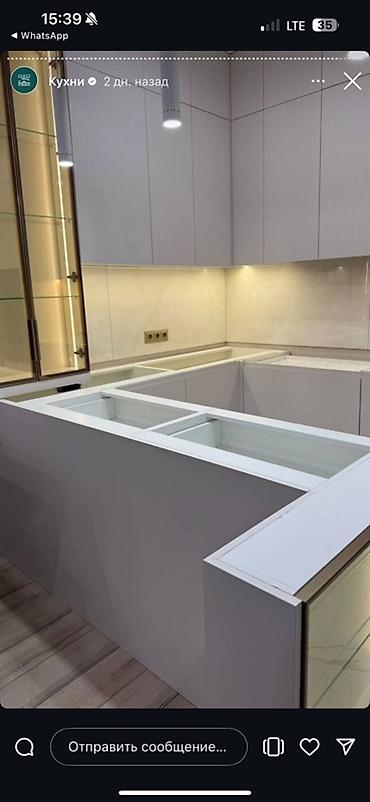 - Столешницы/фартук: монолитная светлая поверхность под камень; фартук из крупных плит под мрамор.