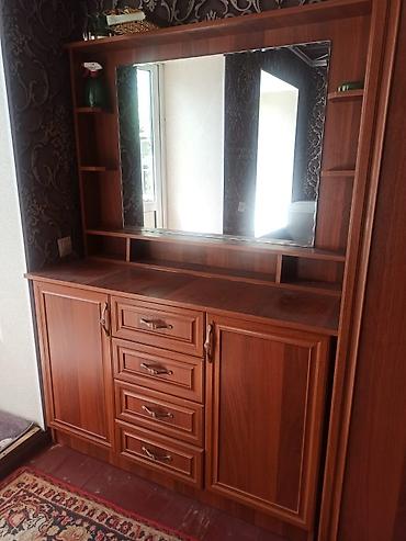 - Комод-трюмо: большое настенное зеркало, тумбы с распашными дверцами по бокам, по центру четыре глубоких выдвижных ящика; открытые полки и ниши для косметики и аксессуаров.