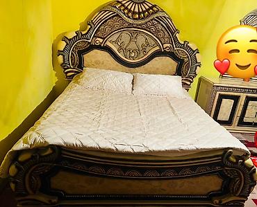 - Двуспальная кровать с массивным изголовьем и изножьем, резные элементы, мягкие вставки с цветочным орнаментом. На фото — комплект постельного покрывала и подушек.