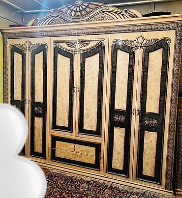 - Шкаф-купе/распашной многосекционный: шесть створок, нижние выдвижные ящики, декоративные панели с узором, навершие в едином стиле с остальными элементами.