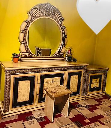 - Туалетный стол/комод с большим круглым зеркалом в фигурной раме; центральный блок выдвижных ящиков и боковые секции с дверцами. В комплекте табурет.