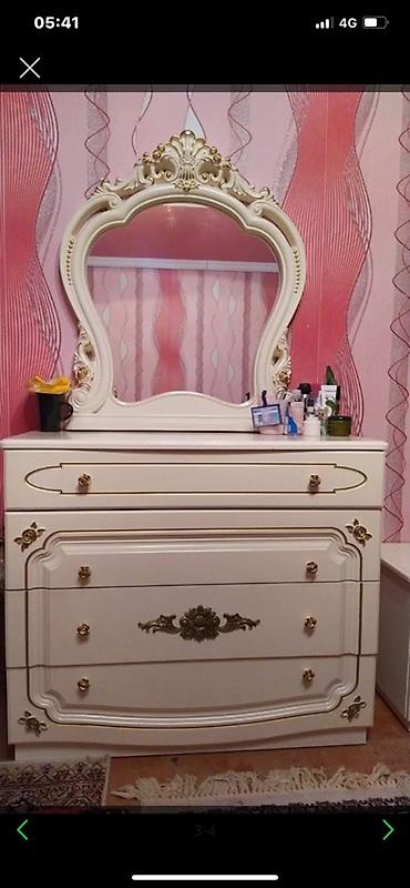 - Туалетный стол/комод с большим фигурным зеркалом: верхний узкий ящик плюс три вместительных выдвижных ящика; фасады с профилем и золотой окантовкой.
