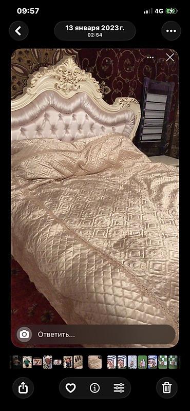 - Кровать двуспальная с высоким фигурным изголовьем, мягкая каретная стяжка, резные элементы и позолоченные акценты.