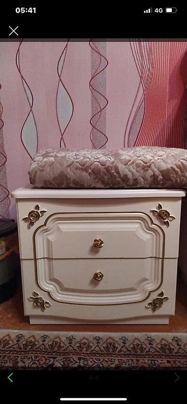 - Прикроватная тумба с двумя выдвижными ящиками; ручки‑розетки и декоративные элементы в золотом тоне.