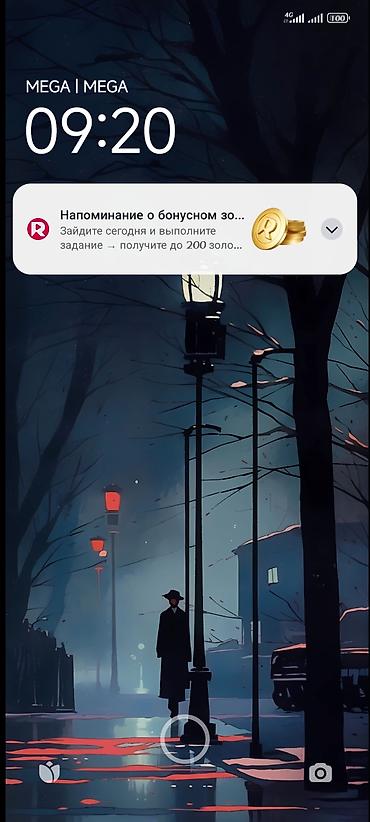 {"textual_description": "Смартфон с отображением экрана блокировки, на котором видно текущее время 09:20 и уведомление о бонусном задании. Устройство показывает полную зарядку батареи и подключение к сети 4G. На экране также присутствует стилизованное изображение ночной улицы с человеком в шляпе и фонарями. В нижней части экрана расположены иконки быстрого доступа, включая иконку камеры.","characteristics":["Тип устройства: Смартфон","Отображаемый экран: Экран блокировки","Время на экране: ,"Уведомления: Бонусное задание","Заряд батареи: 100%","Подключение к сети: 4G","Элементы управления: Иконки быстрого доступа","Фоновое изображение: Ночная улица","Детали фона: Человек в шляпе","Освещение фона: Фонари","Иконка камеры: Присутствует","Интерфейс: Пользовательский","Состояние: Включен","Наличие уведомлений: Да","Уровень сигнала: Полный","Яркость экрана: Автоматическая","Отображение даты: Нет","Модель телефона: Неизвестно","Приложение уведомления: Неизвестно","Отображение оператора: MEGA"]}