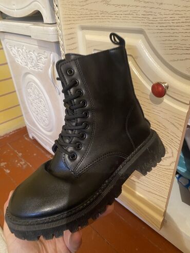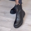 Женские черные ботинки/полусапоги на массивной подошве. - Материал верха: черная кожа (визуально гладкая). - Подошва: высокая, рельефная, с глубоким протектором для устойчивости. - Застежки: молни...