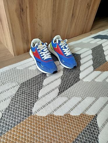 - Цвет: синий верх с красными и жёлтыми вставками, белые шнурки; задняя часть с лаймово‑зеленым акцентом