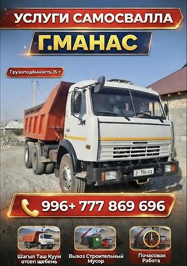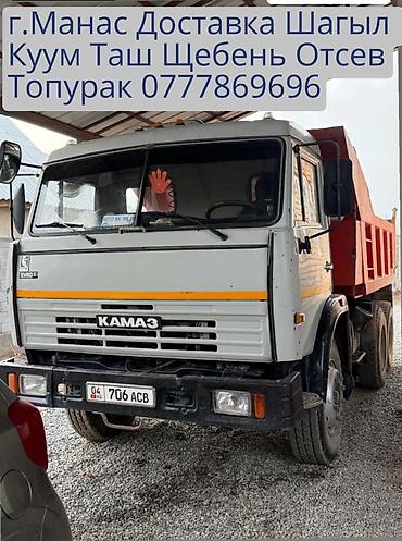 Услуги самосвала, г. Манас. - Грузоподъёмность: 15 т - КамАЗ, бортовой самосвал Виды работ: - Доставка сыпучих материалов: щебень, отсев, гравий (шагаыл таш), песок (куум таш), земля (топурак) - ...