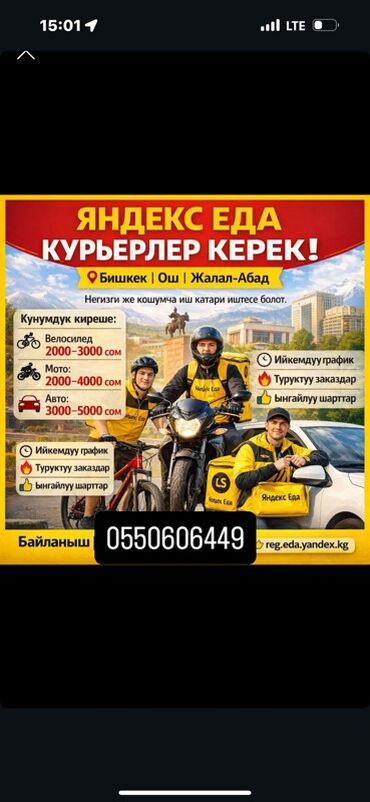Вакансия: курьер службы «Яндекс Еда» Локации: Манас, Бишкек, Ош. Форматы работы: - Велокурьер: доход 1000–2000 сом за смену - Мотокурьер: 2000–3000 сом - Автокурьер: 2000–4500 сом Что предлагает...