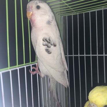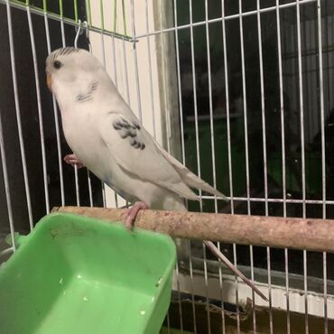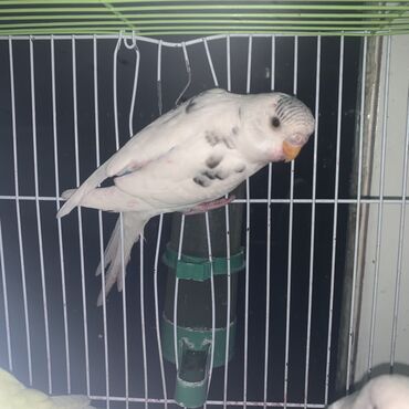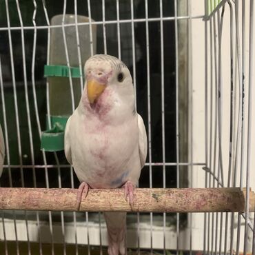 Волнистый попугай светлой окраски (белый ). Из за того что ел свеклу грудинка покраснела Характеристики: - Окрас: доминантно белый, крылья и спина с контрастным синим рисунком, светлый хвост. - К...