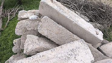 Железобетонные блоки (фундаментные/балочные) - Материал: тяжелый бетон с армированием (видна арматура/петли для строповки на отдельных элементах). - Форма: прямоугольные монолиты. - Примерные габа...
