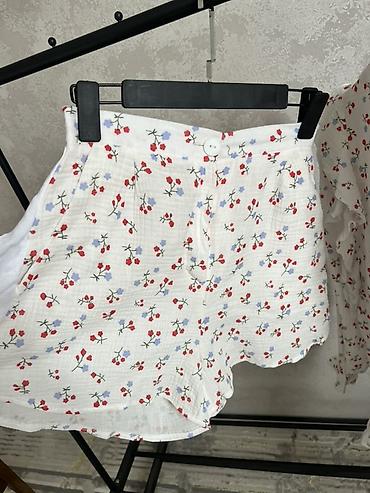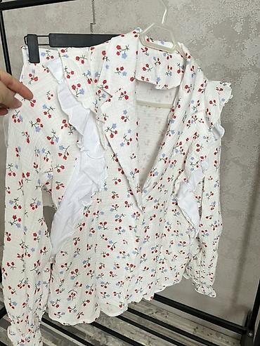 - Принт: мелкие полевые цветы и ягодки в красно‑голубой гамме на белом фоне.