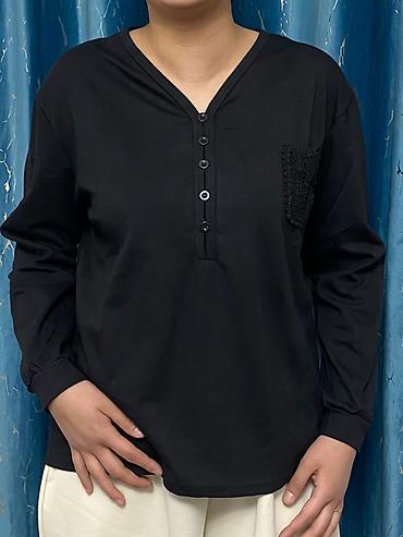 - Черный лонгслив с V-образным вырезом и планкой на 5 пуговиц, декоративный карман с вязаным/кружевным элементом слева.