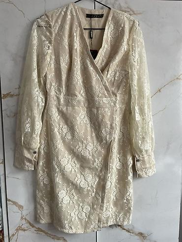 Кружевное платье-миди цвета айвори - Силуэт: прямой, с запахом на