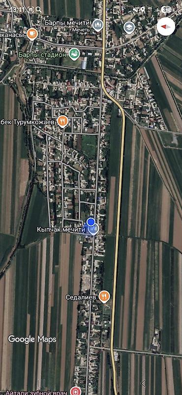 - Точки ориентира для поиска на карте: «Кыпчак мечити», «Седалиев», «Барпы мечити», «Роддом» на трассе; участок находится в жилом квартале, обозначен синей меткой на скриншотах.