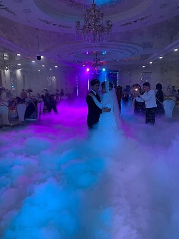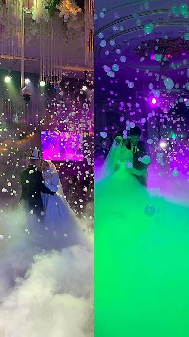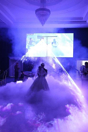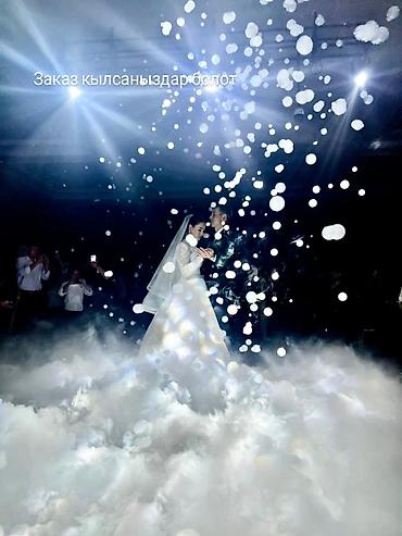 - Профессиональные спецэффекты для мероприятий: плотный «тяжёлый дым» по полу (эффект облаков), снег/пенные снежинки и световые лучи.