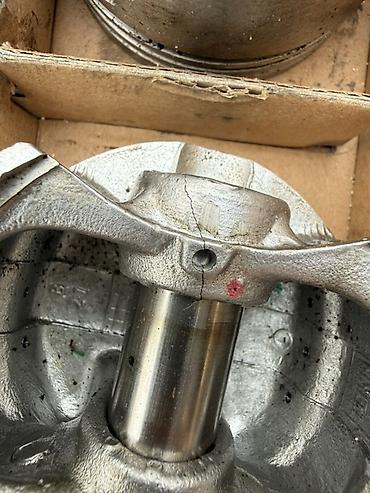- На внутренней стороне юбки/перемычки одного из поршней заметны трещины в районе бобышки пальца.