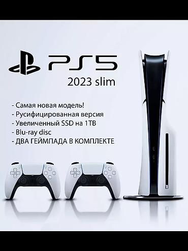 PlayStation 5 Slim (2023) — русифицированная версия с дисководом Blu‑ray и увеличенным встроенным SSD 1 ТБ. В комплекте два беспроводных контроллера DualSense.