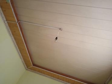 - Светлые реечные потолочные панели с фактурой «под дерево» и контрастной окантовкой по периметру.