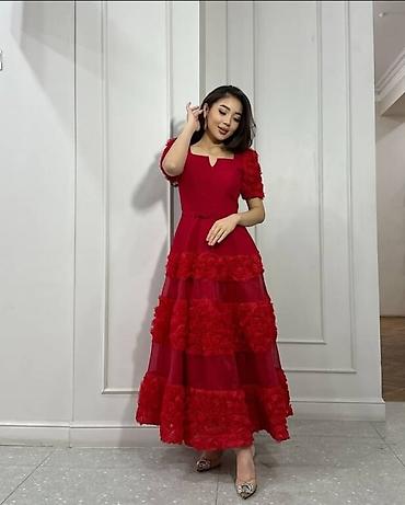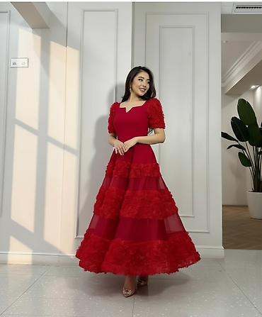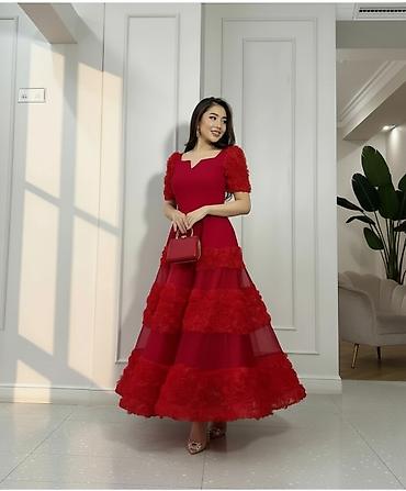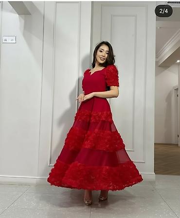 Платье вечернее красное, макси - Фасон: приталенное, в пол, с длинным рукавом - Декор: асимметричная драпировка на талии с металлическим кольцом, удлиненная вертикальная лента-деталь, разрез снизу...