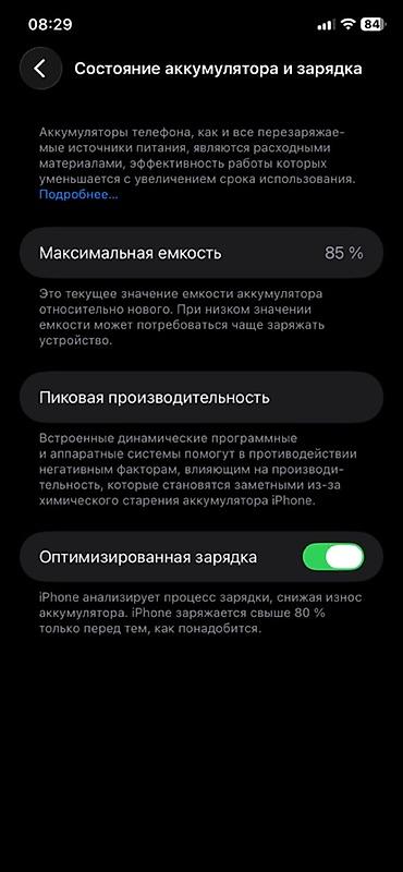 - Аккумулятор: максимальная ёмкость 85%, поддержка «Оптимизированной зарядки»