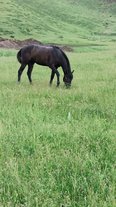 Лошадь (кобылка) Семиз байлоодо 2 ай болду 3 жаш ургаачы Описание: - Масть: темная (вороная/темно-гнедая), густая черная грива и хвост. - Возраст визуально молодой, компактное телосложение, выраж...