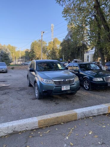 Subaru Forester, кроссовер в фирменном зелёно-сером цвете (металлик). Кузов SG/SH поколения с характерной решёткой и массивным бампером.