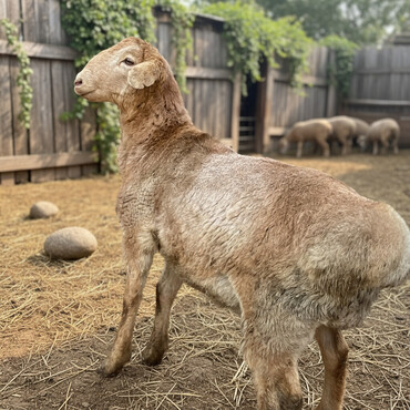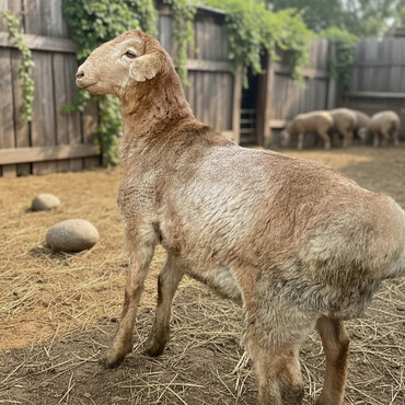 - Порода/тип: бесрогий мясной тип, густая курчавная шерсть рыже‑коричневого оттенка.