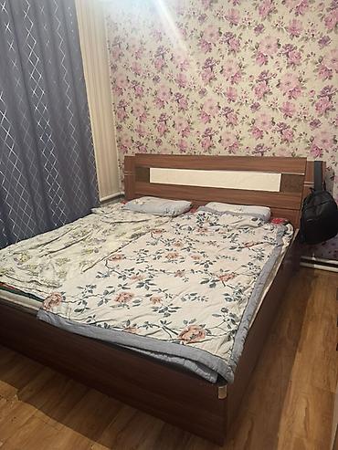 - Двуспальная кровать с высоким изголовьем. Основание — короб с бортами по периметру, предусмотрено пространство для хранения (ниша под матрас/основание). Декор из МДФ с светлыми вставками.