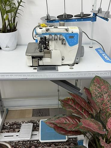 Промышленный оверлок Jack (серия C3) на полноценной столешнице с напольной педалью и стойкой для нитей.
