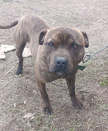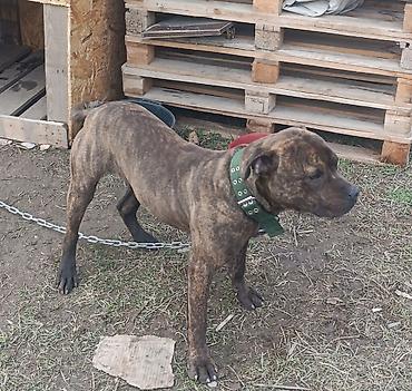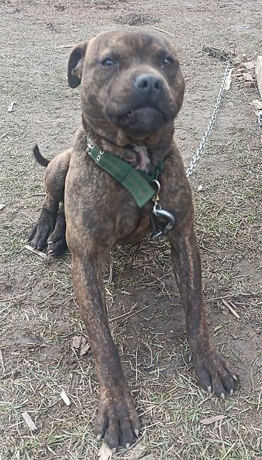 Американский терор пидбуль,среднего размера, тигрового окраса (коричнево‑черный brindle), коренастого телосложения. Короткая гладкая шерсть, мощная грудь и крепкие лапы. Купированный хвост. На шее прочный зелёный ошейник из плотной стропы с металлической фурнитурой; к ошейнику крепится цепь с карабином.