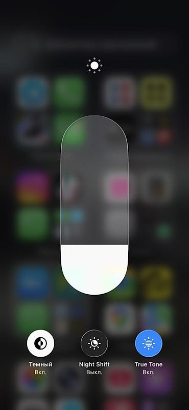 - Включён тёмный режим; Night Shift — выкл.; True Tone — вкл.