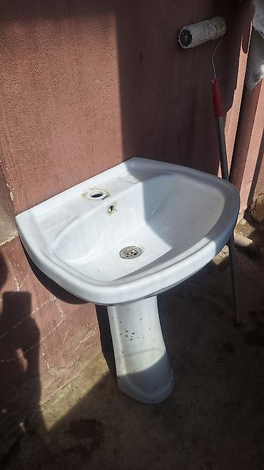 - Раковина с пьедесталом (умывальник «тюльпан») из сантехнического фаянса, сливное отверстие стандартное, предусмотрены места под смеситель и перелив.